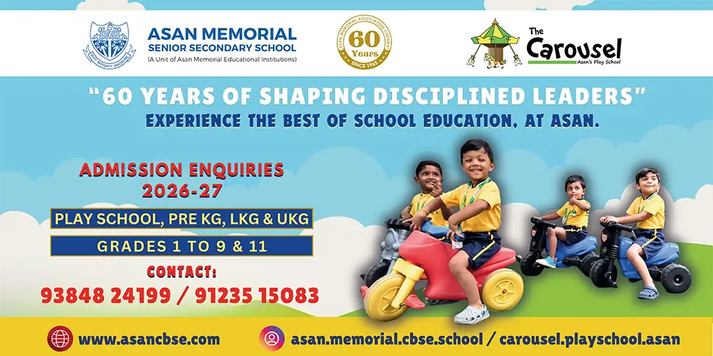 The Carousel is a Play School in the campus of Asan CBSE School and was inaugurated in July 2012 by our Late Chairman Sri A.K. Gopalan. The intention is to give Pre-school children the luxury of continuing their school education on the same premises right from the Play School level to Std XII if they so desire.